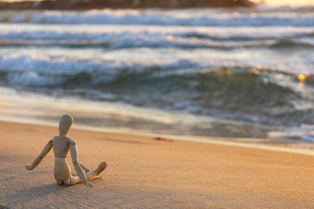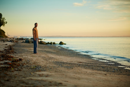 A solitary figure stands on a sandy beach as the sun sets, casting a long shadow. The tranquil ocean waves gently caress the shore.