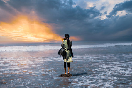 A girl is taking pictures of the sea with her mobile phone, the sun is setting in the sky.
