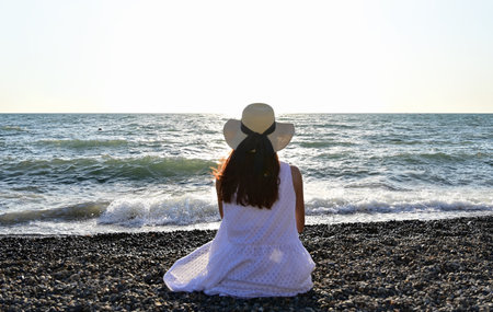 Summer scenery at Baltic Sea on Rugen island in Germany with a young woman sitting on the beach in the morning light.