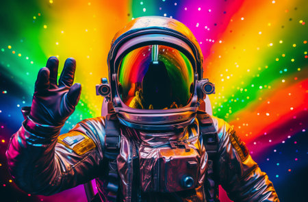 astronaut is standing out in front of a rainbow. Cosmic art, science fiction wallpaper. Beauty of deep space. Billions of galaxies in the universe., by ai generative