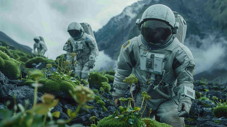 Uncharted Planet Exploration: Astronauts with High-Tech Gear Studying Alien Life
