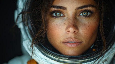 Orbital station cosmonaut mesmerized by beauty of planet in space. Woman looking in awe at galaxy celestial bodies, doing Martian surface research to assist planetary exploration
