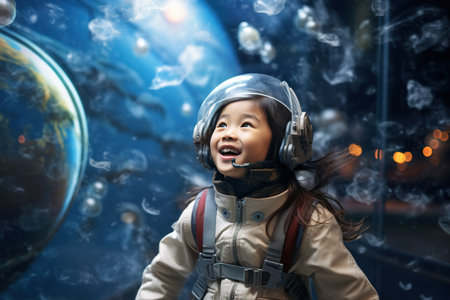 Little asian girl in astronaut suit and helmet against the background of the planet.