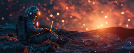 Astronaut in space with a laptop. Banner, copy space. High quality photo