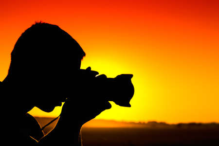 Photographer sitting and checking pictures in camera with back screen of camera when breaking