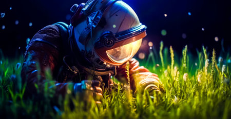 Astronaut in space suit among vibrant flowers in summer meadow. Surreal portrait of a space traveler