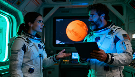 Two crew members in spacesuits collaborate inside a futuristic spacecraft. The man holds a tablet while the woman gestures, with the planet Mars visible on a screen.