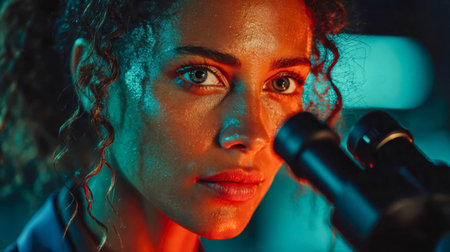 Close-up of a focused female scientist in a laboratory, working with a microscope under dramatic blue and red lighting.