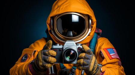 American astronaut in space suit floating in space, taking photographs with a digital camera