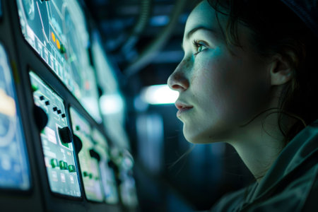 A woman is looking at a computer monitor with a serious expression on her face. The monitor displays a lot of information, and the woman is focused on it. Concept of concentration and determination