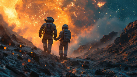 The side view of the couple astronaut human that has traveling to the various place on the land but yet it looks like human still trying to find something to be next target of the exploration. AIGX03.