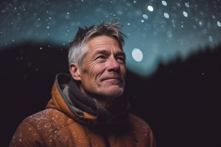 A smiling man in a festive hat looks up in wonder, surrounded by colorful bokeh lights and confetti.