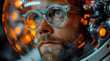 Man in a space suit with glasses looking through a window. Concept of curiosity and exploration, as the man is looking out into the unknown