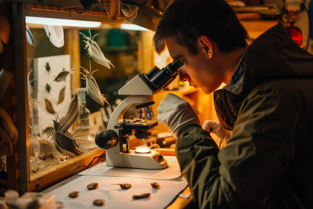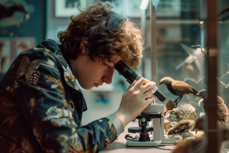 A biologist studying animal specimens under a microscope --ar 3:2 Job ID: fe6970fe-8f10-42bd-8684-6cd1eabb21d5