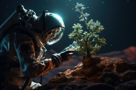 An astronaut in a spacesuit explores a plant on an unknown planet. Space explorers, Galaxies.
