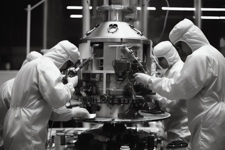 Generative AI : Satellite Under Construction in Aerospace Technology Manufacturing Facility Development of Spacecraft for Space Exploration Navigation Communications Internet Telec