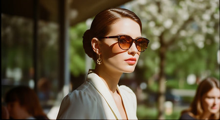 A stylish woman wearing sunglasses and earrings stands outside on a sunny day