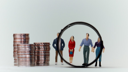 Portrait of two young businessmen in business clothes. A business woman in glasses, watching a man boss, counting money from a pack of dollar bills, gives her a salary