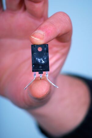 A technician install the new transistor in modern electronic device. Masss production. Modern technology macro concept.