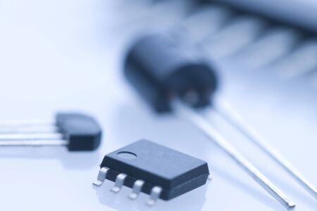 Semiconductor transistors and mosfets isolated on white background.