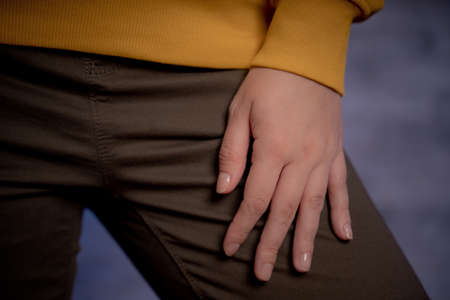 Front view on body part of young female in sweatshirt and trousers. Close up of figure of unrecognizable woman on gray brick background
