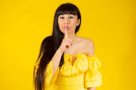 Portrait of beautiful and young brunette woman standing over isolated yellow background asking to be quiet with finger on lips. Silence and secret concept.
