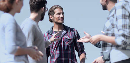 Startup partners standing in circle and talking in meeting room. Business colleagues in casual working together in contemporary office space. Teamwork or brainstorming concept