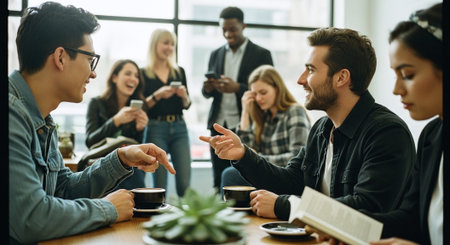 A group of young adults socializing in a cafe, two men engaged in conversation over coffee, others in the background using phones and laughing