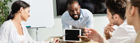 smiling african american businessman showing digital tablet to colleagues in conference room, banner