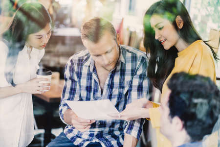 Young Asian man meeting with professional stock market traiders in office and asking for advice