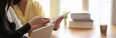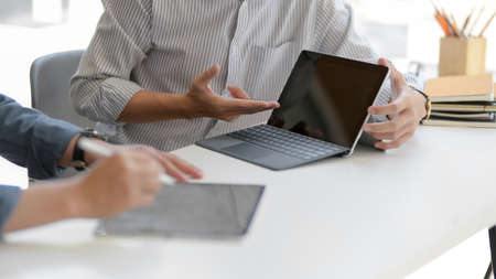 Close-up view of professional startup team planing the project together while using tablet and laptop computer