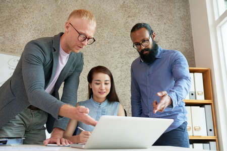 Business team watching presentation on laptop screen and discussing news project and its perspectives
