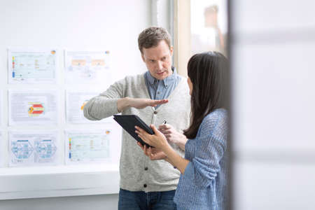 Caucasian business partners researching on digital tablet for designs of new logo for company sitting in open office