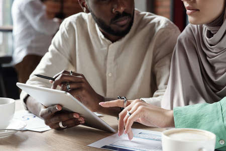 Close-up of Muslim woman in rings pointing at tablet screen while discussing internet resources with black colleague
