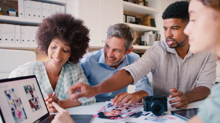 Creative director and colleagues reviewing photographic prints spread out on a table in a modern office