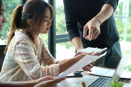 Team work discussing in valuation data in meeting room, three business people with accounting paper charts.