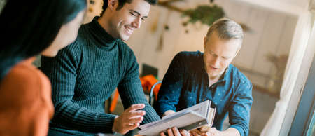 group of multi nation friends enjoy conversation with fun and happiness meeting business casual ideas concept with cafe restaurant background