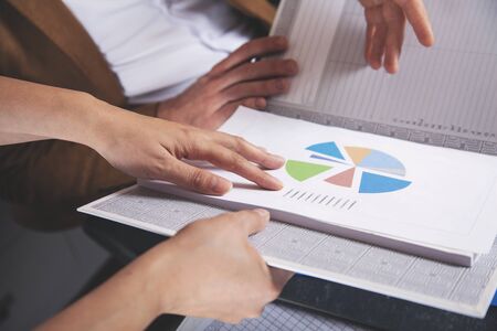 Business people discussing charts and graphs showing the results of successful teamwork on charts and graphs showing the growth of investment results of teamwork. Close up.