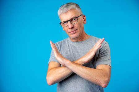 Stay out. Refusal gesture. Forbidden way. Stop sign. Keep distance. Gloomy young man holding crossed arms looking at camera isolated on blue copy space.