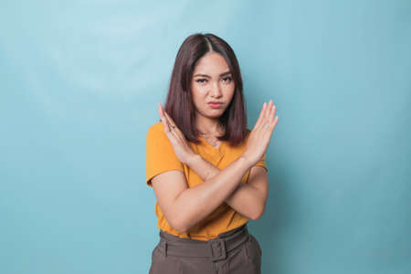 Stop. Concerned Asian woman showing refusal sign, saying no, raise awareness, standing over blue background