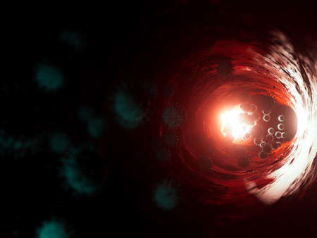 A concept showing coronavirus covid-19 particles inside a human organ vessel backlit by a bright light - 3D render