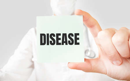 Doctor holding card in hands and pointing the word DISEASE