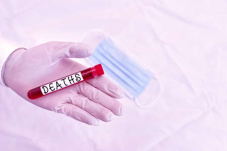 Conceptual hand writing showing Deaths. Concept meaning permanent cessation of all vital signs, instance of dying individual Blood sample vial ready for medical diagnostic examination