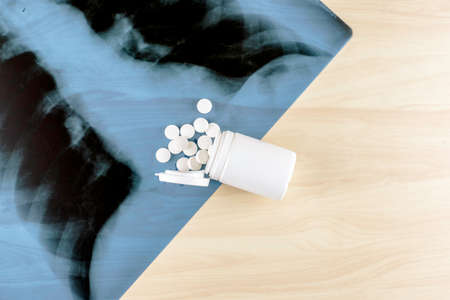 Lung X-ray blister with pills on the table with copyspace. High quality photo