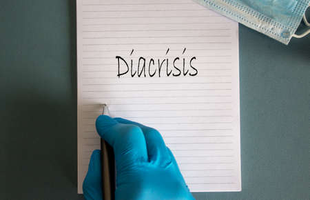 Hand in blue glove, white card with word 'discrisis' and medical mask.