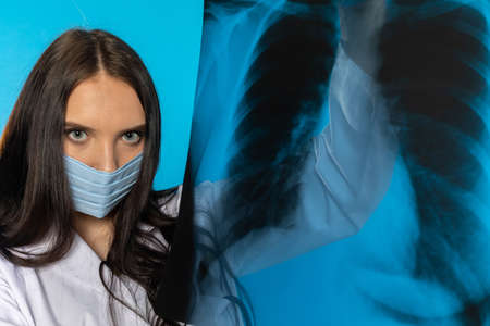 young male doctor in a mask from a virus, examines an x-ray.