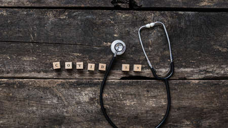 Covid 19 sign spelled on wooden blocks with medical stethoscope placed around it. Over rustic wooden background.