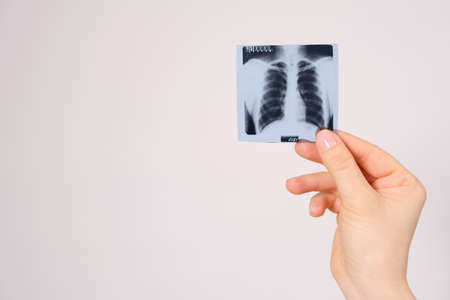 X-ray of the lungs in the hands of the doctor on the background of a white brick wall. Pneumonia of the lungs. diagnosis and concludes the patient.