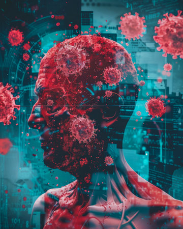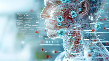 This captivating image showcases the intricate workings of human anatomy as it presents a man's head featuring a detailed brain and vascular system in a striking X-ray style. This artwork serves as a thought-provoking visual that embodies the intersection of science and medicine, bringing attention to the complexities of human biology.