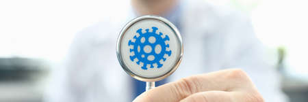 Doctor holds stethoscope infected with coronavirus. Fast-growing healthcare segment. Reduce number trips to doctor thanks to telemedicine. Determining prognosis disease during pandemic